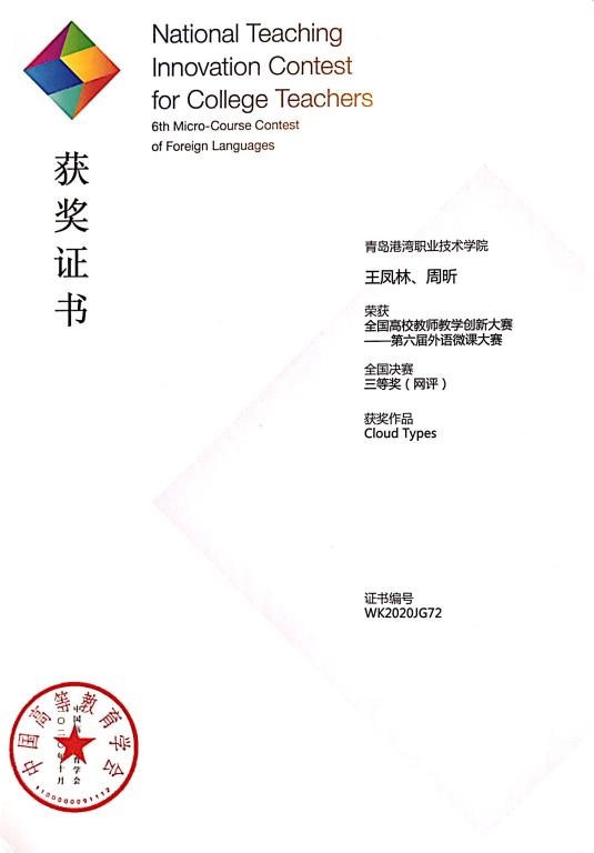 近日,全国高校教师教学创新大赛——第六届外语微课大赛传来喜讯,我校海事学院王凤林、周昕两位教师的作品“Cloud Types”(云的类型)喜获山东省赛一等奖,全国三等奖。