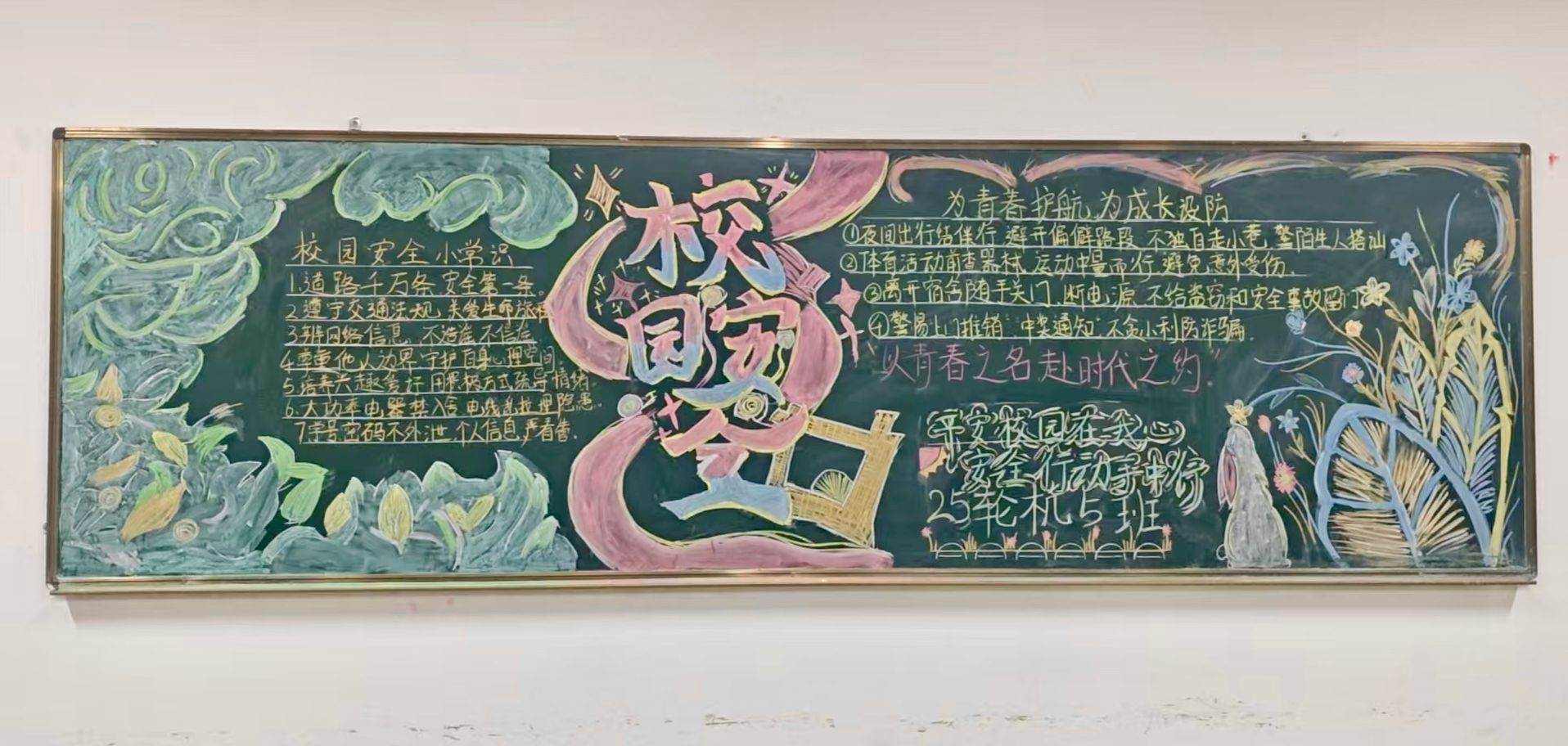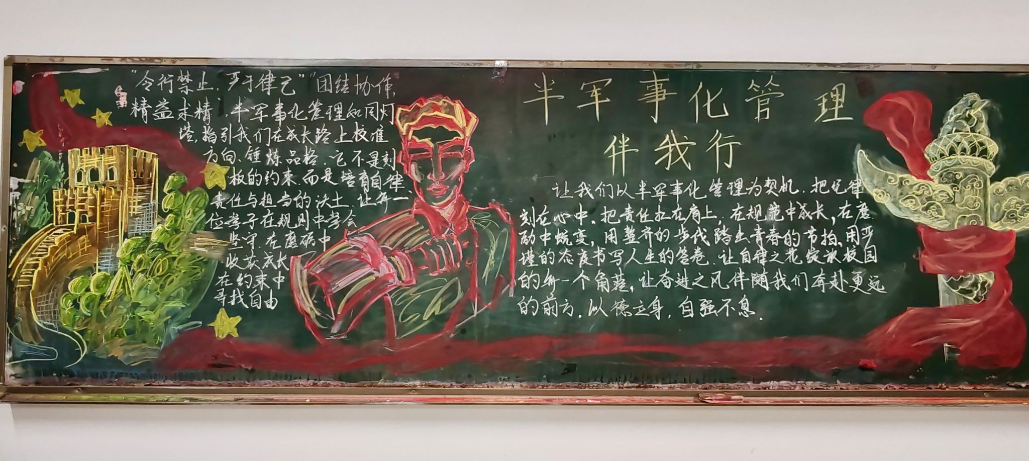 活动启动以来,各班级紧扣“半军事管理”核心,结合航海专业特色与日常行为规范,展开构思精心创作。各班级板报内容,风格不一,既有队列训练、内务整理等日常场景的生动描绘,也有航海法规、安全准则的系统呈现;既融入锚链、船舵、罗盘等航海元素,又搭配“崇军尚纪”“笃行致远”“乘风破浪”等励志标语,将纪律意识、职业精神与青春朝气融为一体。同学们分工协作,让一块块黑板报成为展现班级风貌、传播军管理念的鲜活载体。