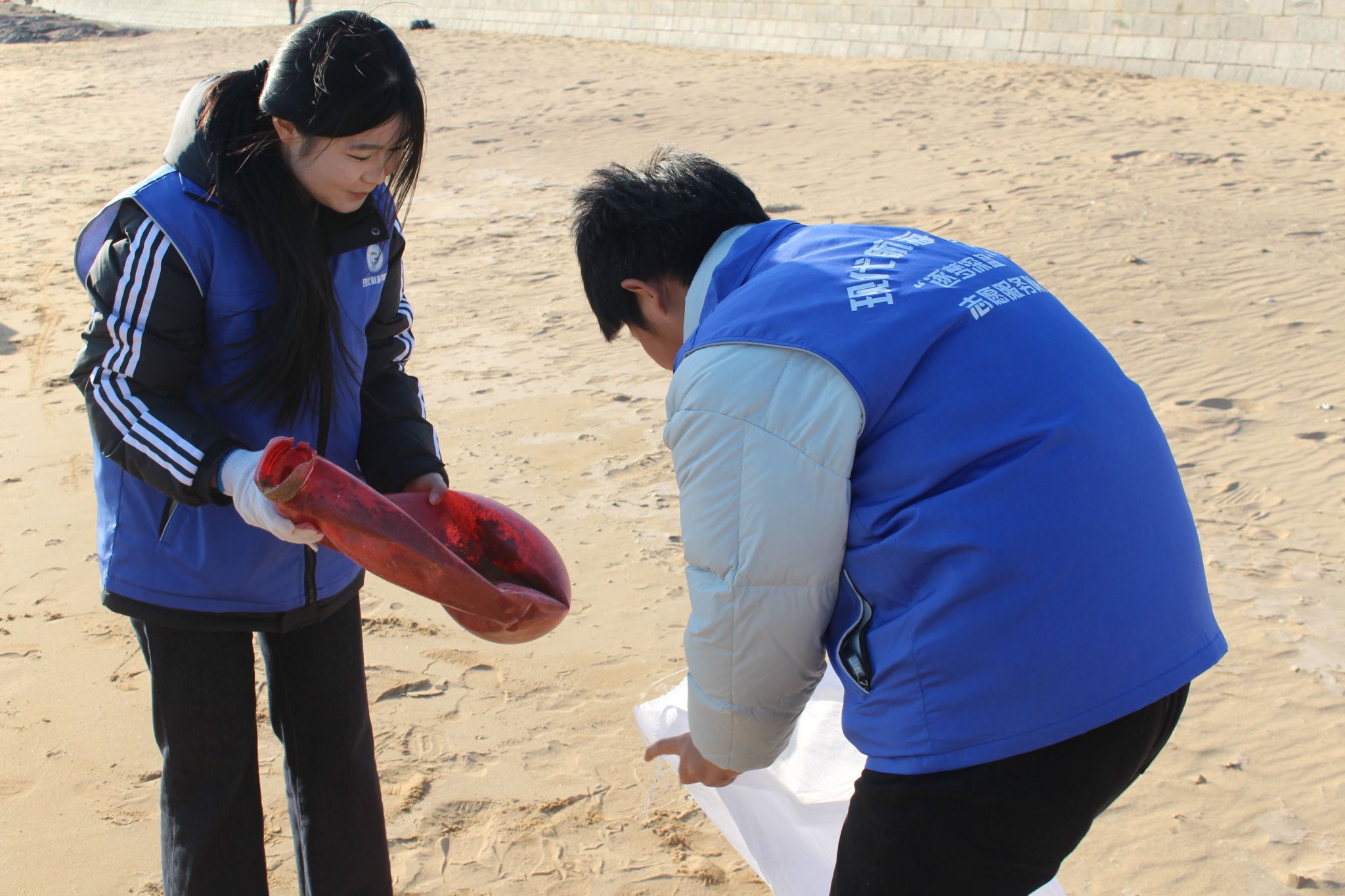 活动伊始,两校志愿者身着统一志愿服装,迅速集结并投入工作。队员们分工明确、配合默契,在分发工具后,立即对海岸沿线进行清理。志愿者们细致捡拾散落垃圾,科学分拣回收各类废弃物,以实际行动还原海滩洁净面貌。与此同时,两校学子还在休息间隙积极交流环保心得与校园生活。整场活动始终洋溢着团结协作、积极向上的氛围,充分展现出当代青年志愿者务实担当、充满活力的精神风貌。