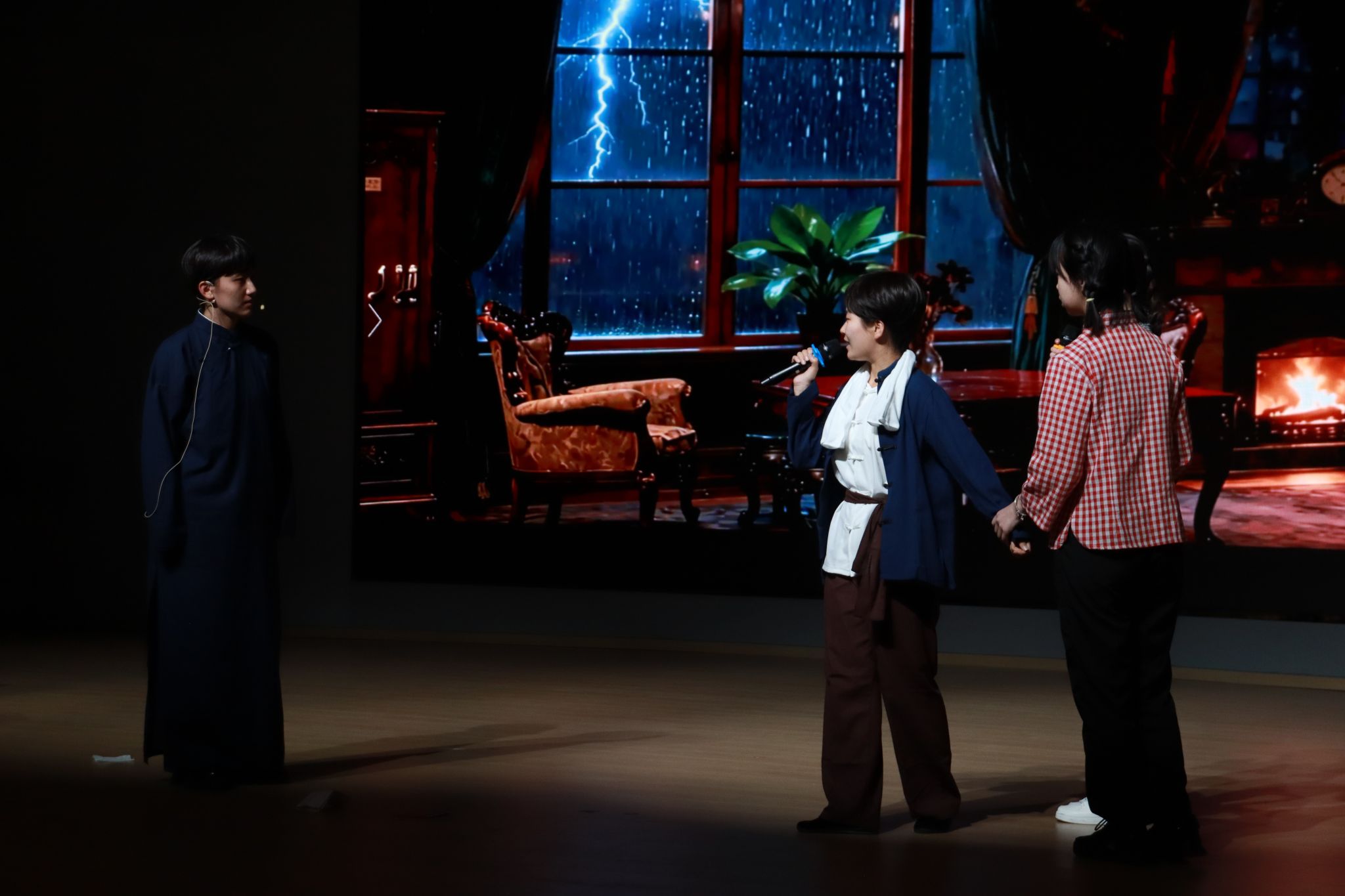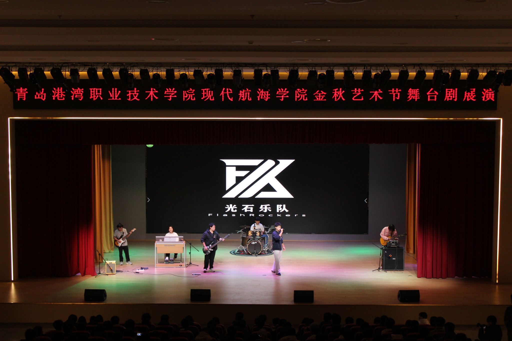 展演在深沉厚重的历史叙事中拉开序幕。舞台上,演员们身着民国服饰,在“我的一九一九”等的历史标语下,将观众带回那个风雷激荡的年代,生动演绎了《山河回响》、《觉醒年代》等剧目。现场观众情绪高涨,与舞台上展现的民族气节同频共振。应急管理学院选送的《亮剑》以磅礴气势,再现了英雄儿女的坚毅精神。在弘扬历史精神的同时,舞台亦聚焦未来梦想与科学探索。国际商贸学院的《破茧·逐光》别出心裁,身着实验服的学生在“实验室”背景前专注探索的场景,巧妙地将青年学子的个人成长与国家科技进步的宏大叙事相结合。由汉文化、墨韵、纸艺协会联合呈现的《十二风华鉴》成为亮点,表演者或身着华丽戏曲行头,或衣袂飘飘演绎古典舞韵,呈现出一幅美轮美奂的中华风华长卷。智慧港口学院带来的《雷雨》片段,通过简洁而富有张力的人物独白,深刻揭示了复杂的人性与命运。现代航海学院选送的《暗夜芳华》中,演员们通过极具冲突性的场景,细腻刻画了人物的情感挣扎与抉择。整场演出形式丰富,涵盖了从深沉话剧到现代乐队的多元艺术表达。光石乐队以《火车驶向云外,梦安魂于九霄》和《夏日漱石》两首歌曲燃爆现场,强劲的节奏瞬间点燃了全场的青春激情。