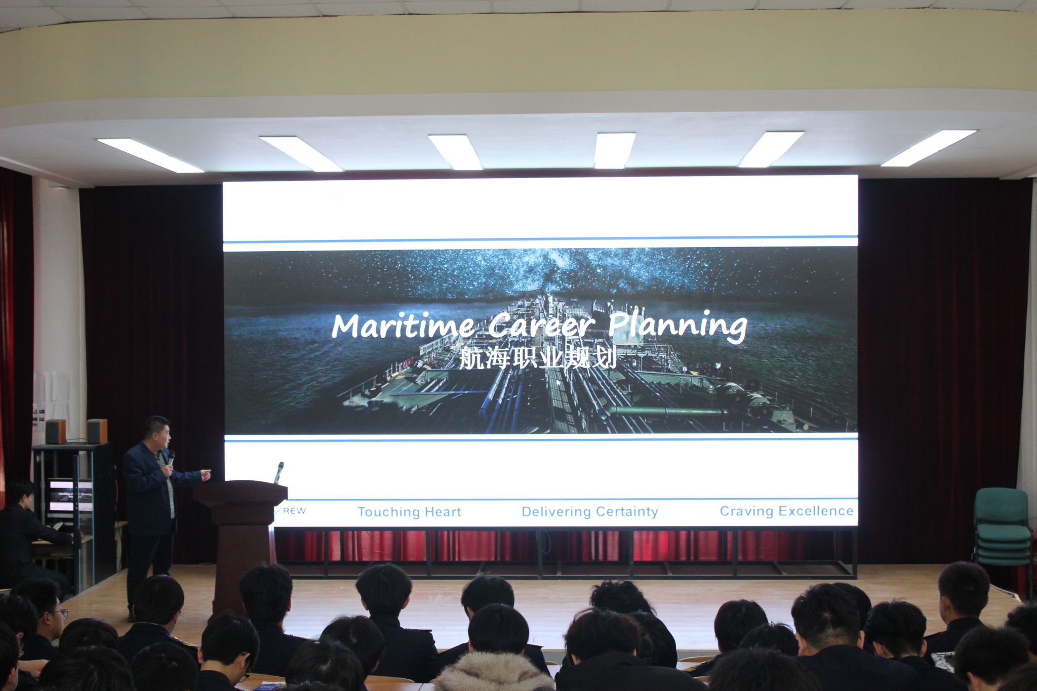 近日,现代航海学院特邀资深尹国杰船长走进校园,为学子们带来“航海职业规划”专题讲座,助力同学们明晰职业方向、感受航海文化魅力。讲座现场座无虚席,学子们认真聆听,沉浸在航海事业的厚重底蕴与广阔前景中。