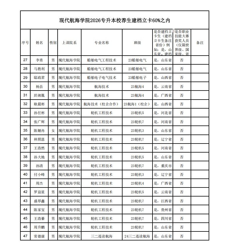通知公告 当前位置: 首页 >> 新闻中心 >> 通知公告 >> 正文 现代航海学院2023届毕业生2026年普通专升本考试建档立卡名单公示 发布日期:2026-01-04 点击: 现代航海学院既是建档立卡生又是在前60%以内的2026年专升本校荐资格学生名单予以公示。 上一篇:现代航海学院2023届毕业生2026年专升本校荐生名单公示